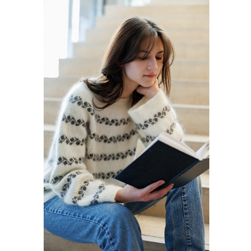 In this sweater, the flowers themselves form the stripes, creating a soft and elegant rhythm across the fabric. If you prefer a more minimal look, you can also choose to work just a couple of floral lines across the chest.
