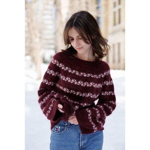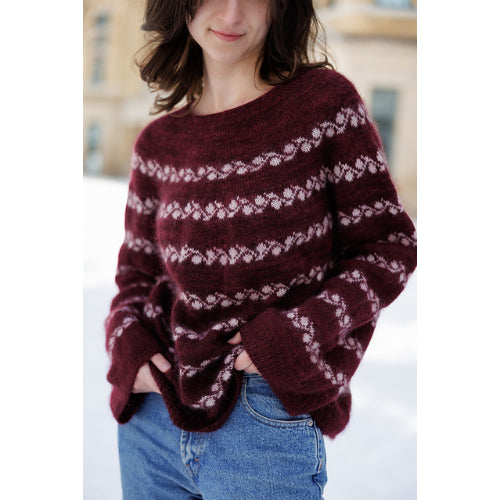The construction is a yoke-style design with a few short rows and a touch of raglan shaping. It is worked top-down and completely seamless, making it approachable and enjoyable to knit. It is also especially friendly for knitters who have never tried colorwork before.