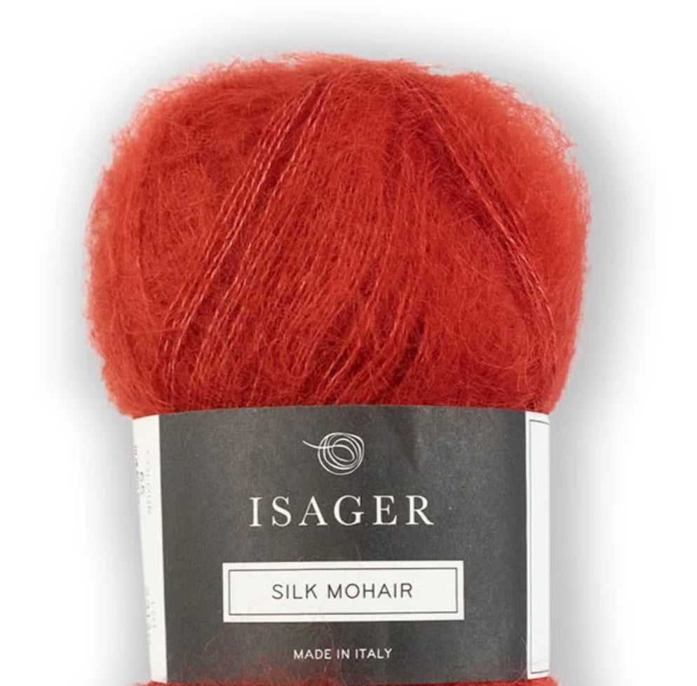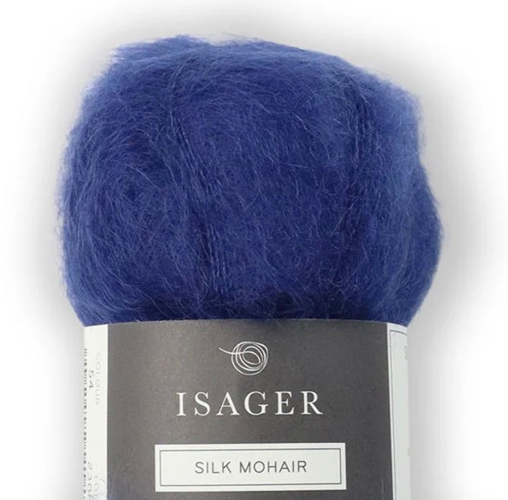 Isager's Silk Mohair is a beautiful laceweight blend of 75% mohair and 25% silk is as light and airy as a cloud. Available in a rich colour palette. Works great held together with Isager's other yarns but can also be worked by itself.