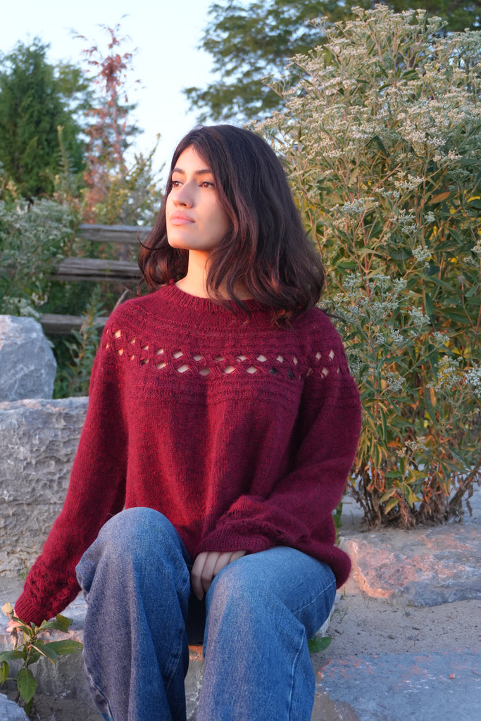 When I knit this sweater, I imagined the women in Modigliani’s portraits—serene, graceful, draped in rich tones of burgundy. The elongated neckline, the subtle geometry of the sleeves, and the softness of the fit all come together in harmony.
